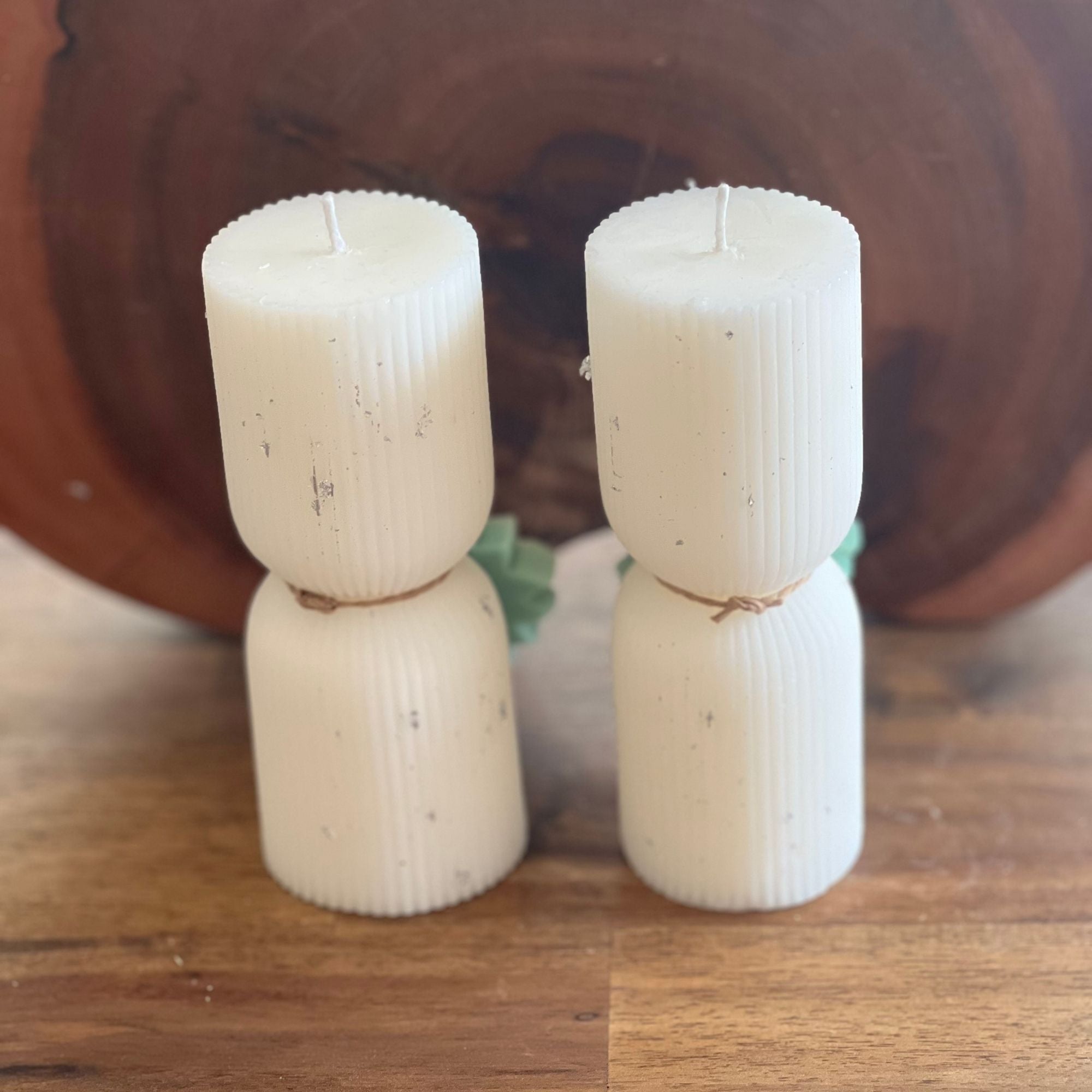 A quiet duo, cast in clean lines. This 13cm pillar pair features a stacked ridge design with subtle seasonal detailing, offering a minimal silhouette that suits any space. Lightly vanilla‑scented, they bring a soft, warm presence to shelves, tablescapes and gifting moments.